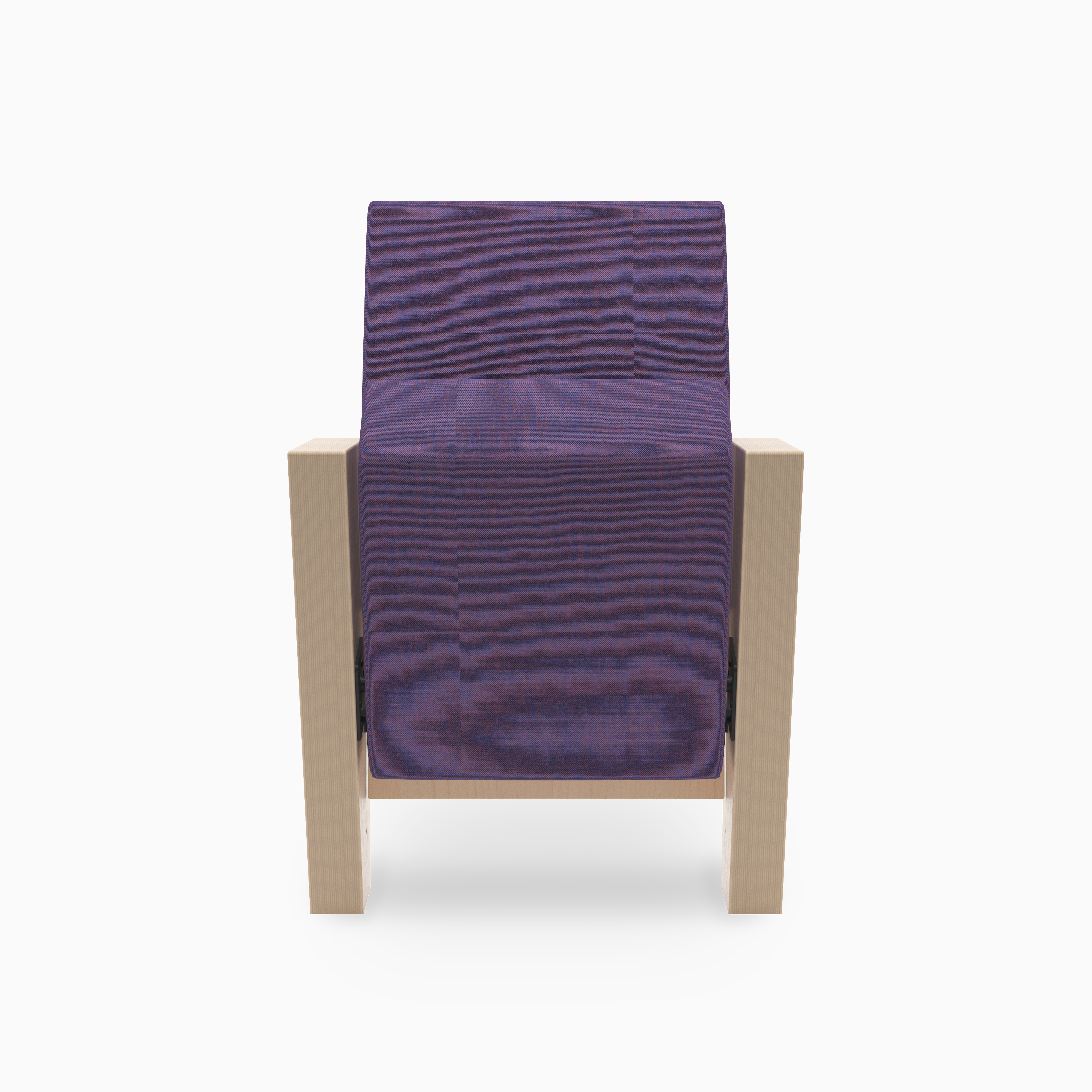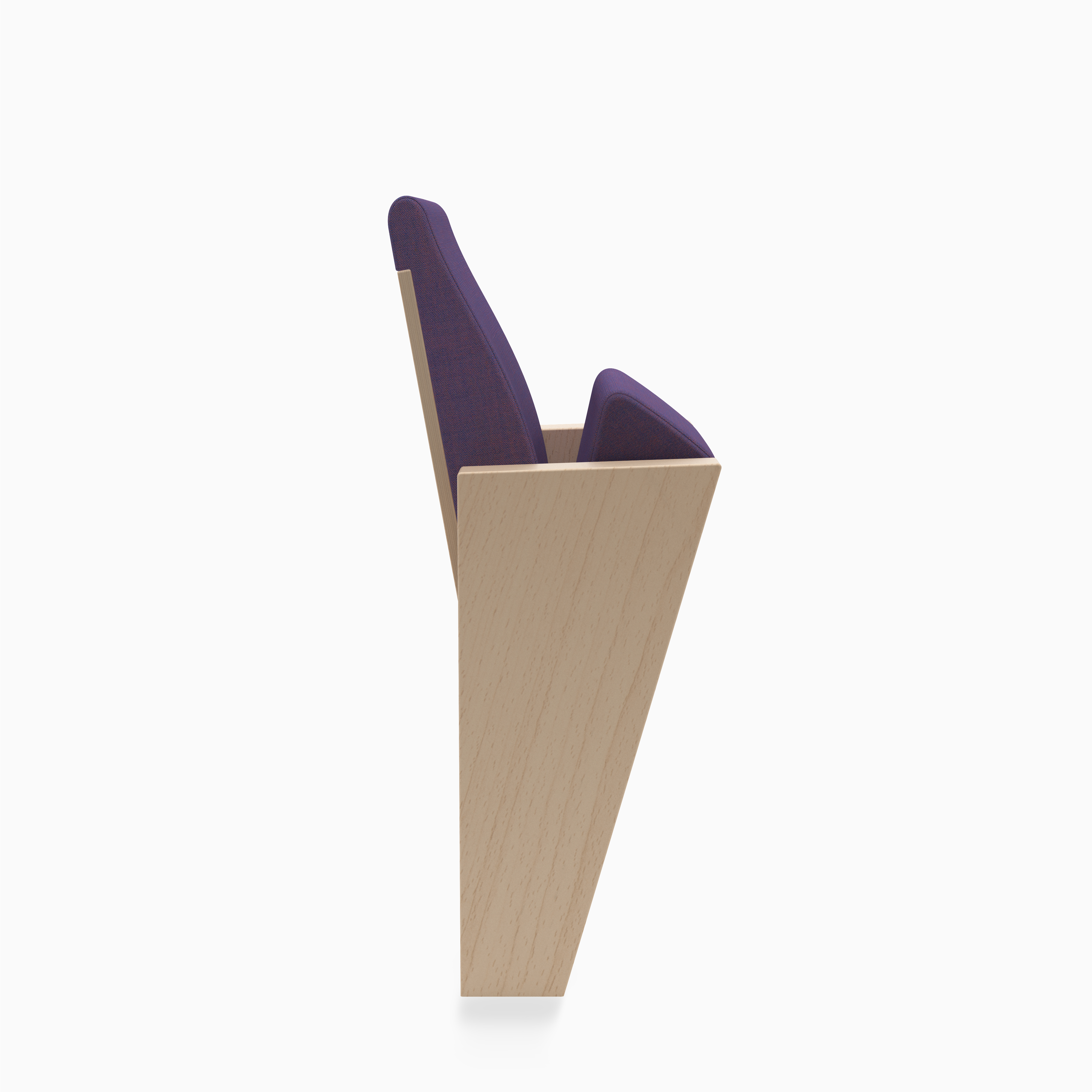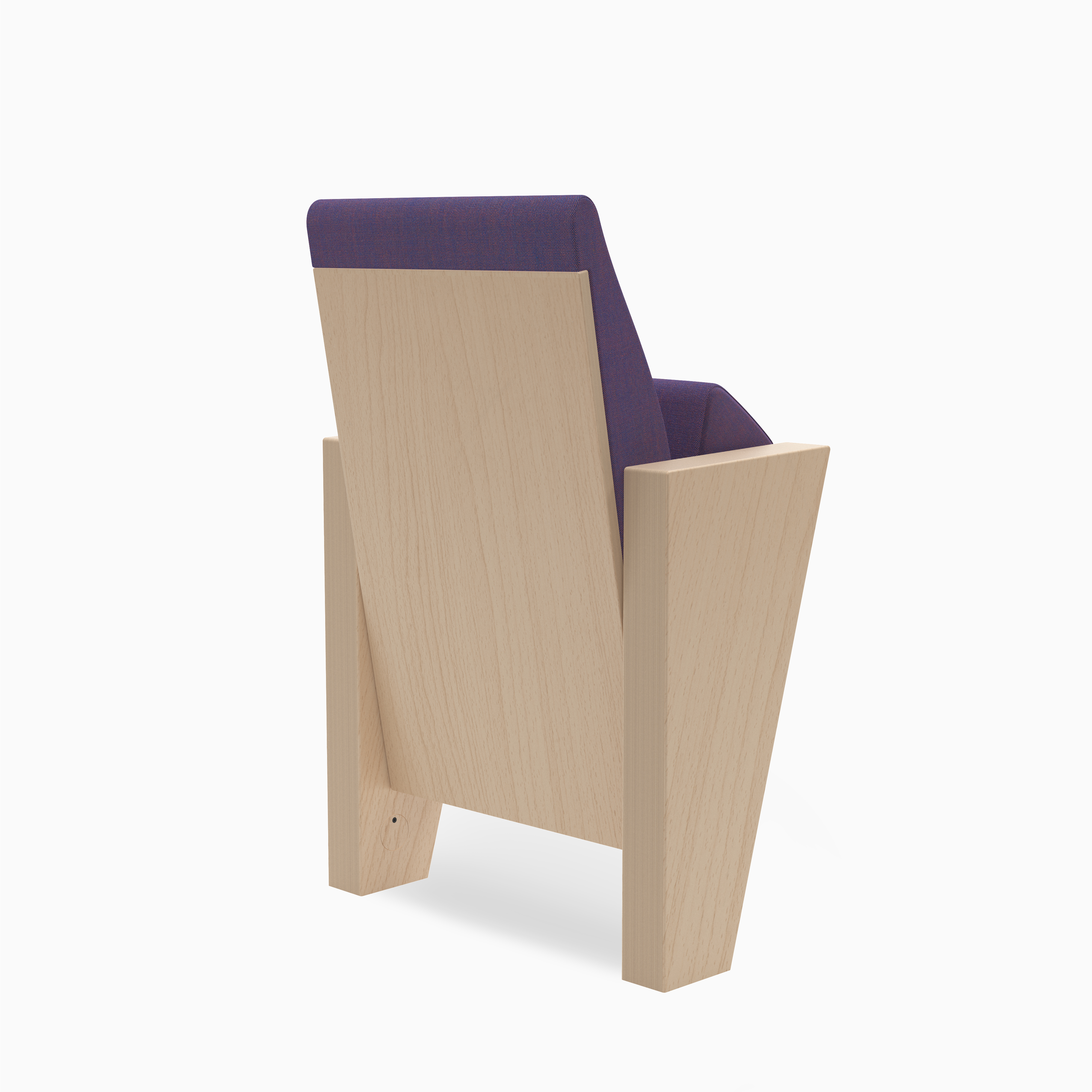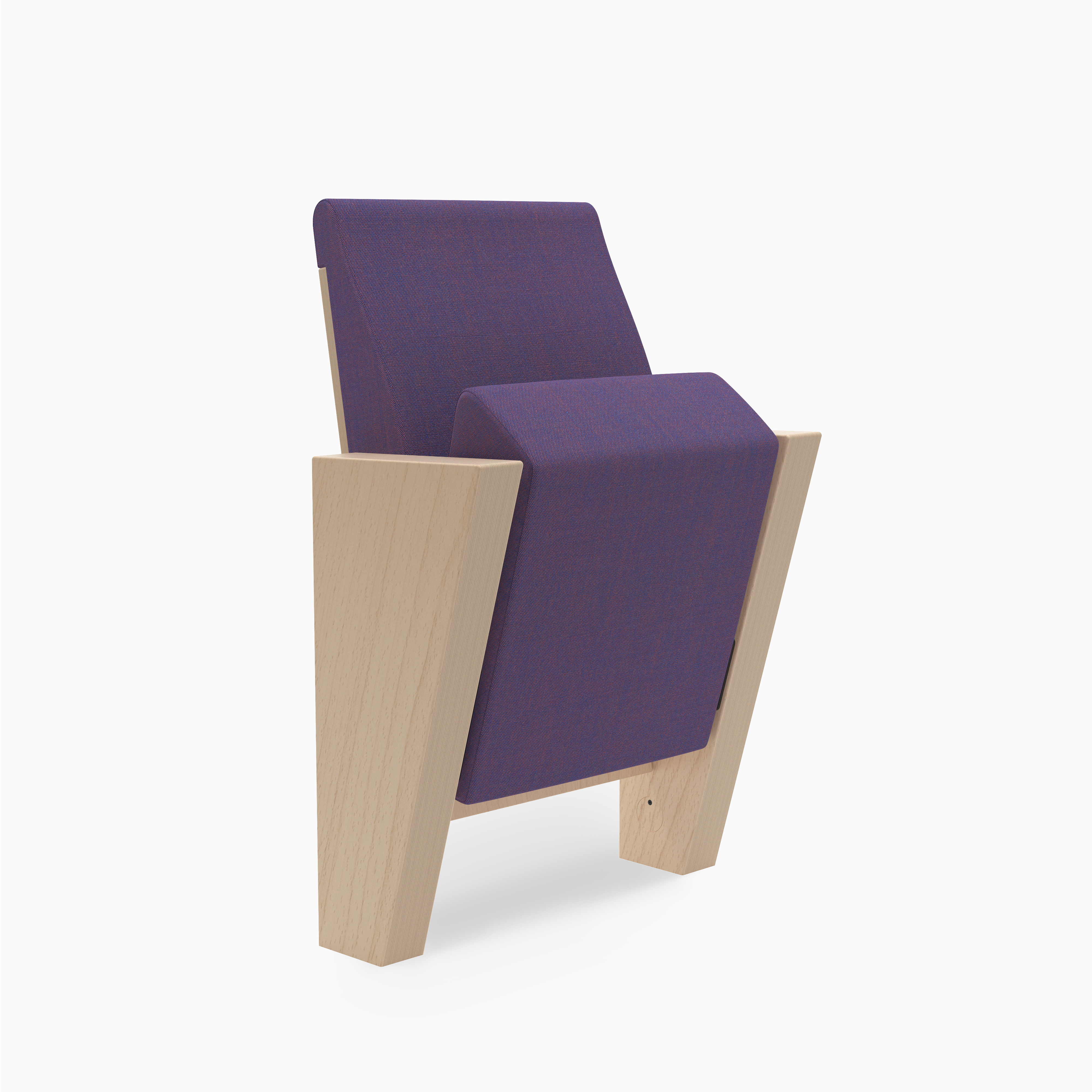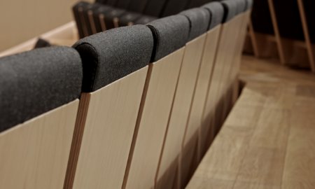 Talia is a seat designed for modern concert and performance halls, where aesthetics must go hand in hand with durability. Its lightweight form is defined by legs that taper downward and a backrest that narrows towards the top. The angled front edge of the seat adds balance to the overall geometry. Visible plywood on the backrest and legs emphasises the natural character of the materials, while melange fabrics add depth and elegance.